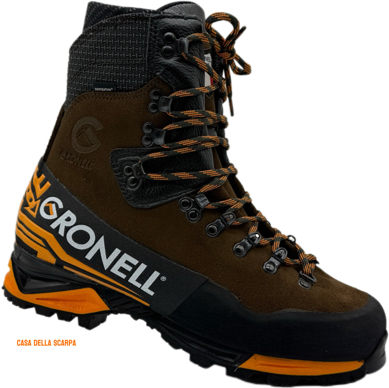 Scarpone da montagna robusto in pelle pieno fiore con membrana GORE-TEX® per impermeabilità e traspirazione. Suola Vibram® per massima trazione su terreni difficili. Compatibile con ramponi semi-automatici, ideale per alpinismo e trekking impegnativi.
